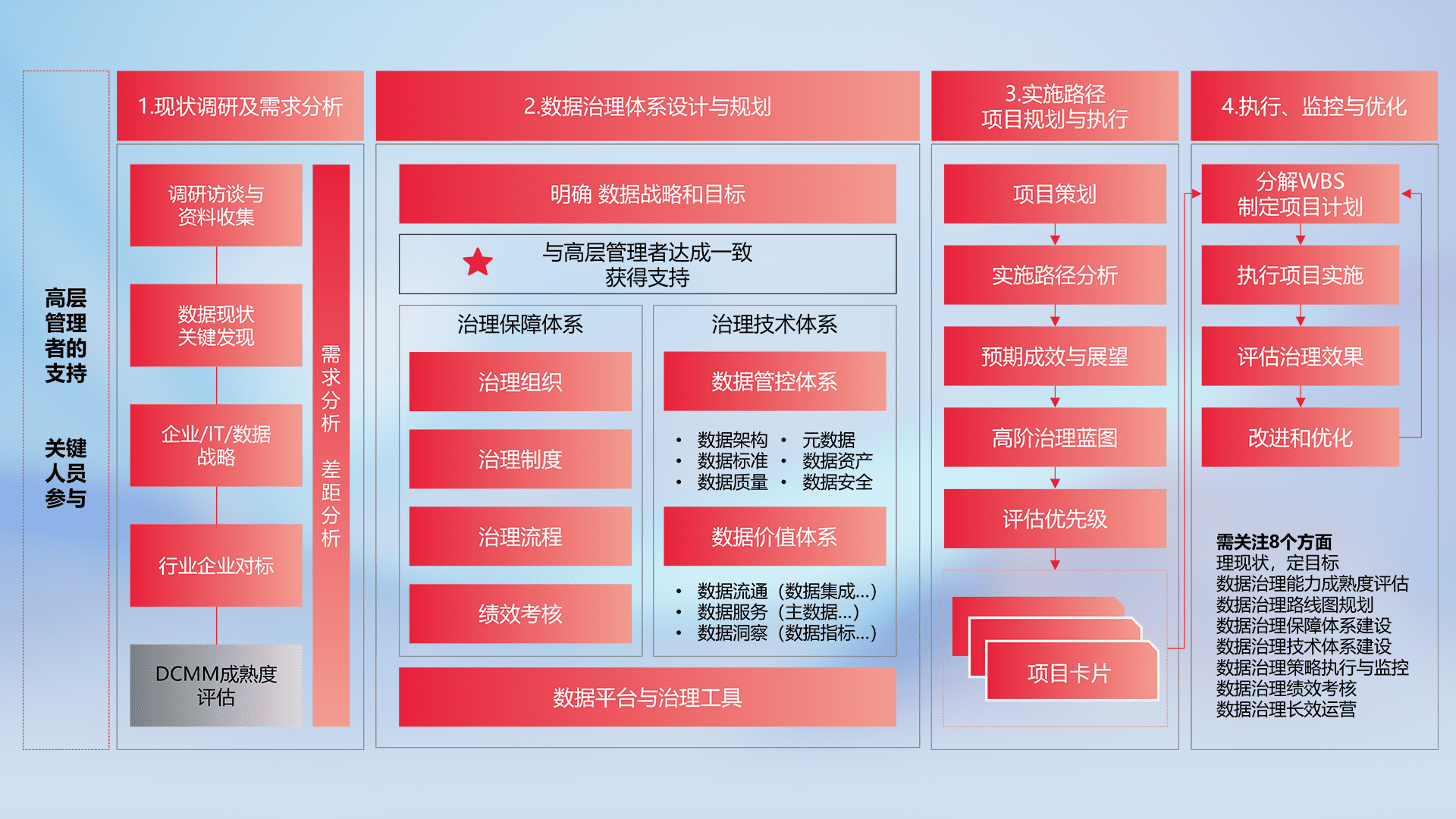 制定并执行统一的数据标准,,,,规范数据定义和格式,,消除冗余和不一致性,,,,实现跨部门和跨系统的数据一致性,,,,为企业提供标准化的数据基础。。